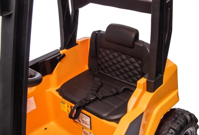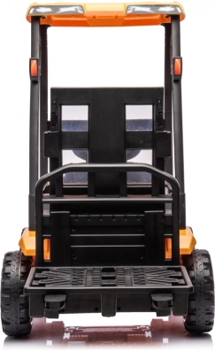 Realistische Elemente wie der elektrisch gesteuerte Mast mit Gabelhub auf/ab, ein beleuchteter Schalter, die Hupe und die mitgelieferte Palette (40×27×8 cm) fördern kreatives Spiel und Motorik. Der breite gepolsterte Sitz mit Sicherheitsgurten, die hohe Sitzposition und die großen Räder 23×8 cm gewährleisten Stabilität und Komfort. Die robuste Konstruktion trägt bis zu 30 kg und dank einer Bodenfreiheit von 14 cm meistert sie auch Unebenheiten.