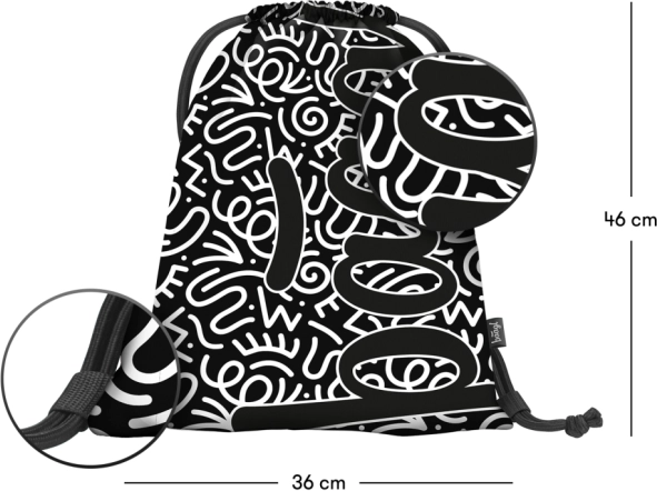 Stabiles Etui mit aufklappbarer Trennwand, Reißverschlusstasche und Platz für den Stundenplan. Der abwaschbare Beutel mit robusten Kordeln eignet sich für Schuhe und Freizeitaktivitäten.