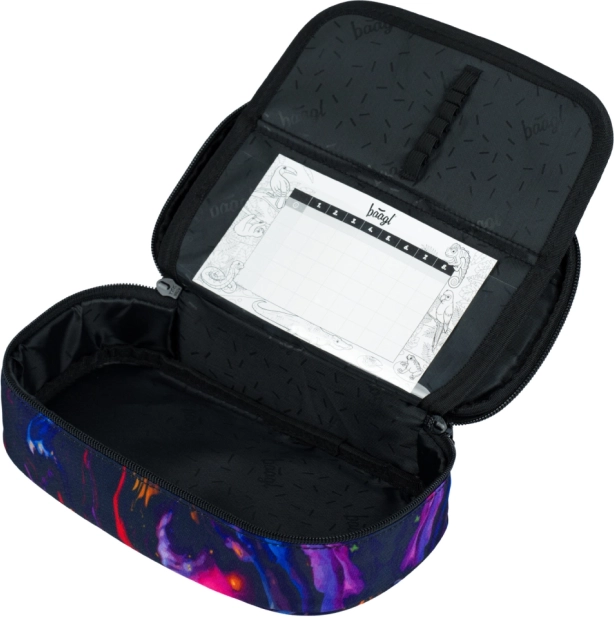 Stabiles Federmäppchen mit aufklappbarer Trennwand, Reißverschlussfach und Platz für den Stundenplan (ohne Inhalt). Robuster Beutel mit Kordelzug aus festen Kordeln zum Tragen auf dem Rücken.
