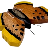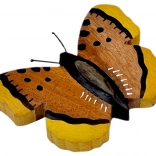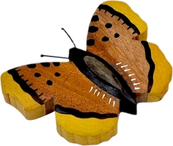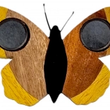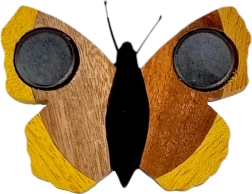 Bringen Sie ein Stück Natur nach Hause mit dem Holzmagneten in Schmetterlingsform. Jedes Stück ist handgefertigt und bemalt, wobei die Farbigkeit aus der Kombination von bis zu fünf Holzarten entsteht – von heller Gmelina über gelben Brotfruchtbaum bis hin zur dunkleren Kassie. Das Ergebnis ist eine authentische Optik mit feiner Holzmaserung.