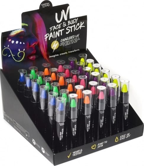 Wir präsentieren Ihnen unsere UV-Gesichts- und Körperfarbe in Stiftform, ideal zum Erstellen erstaunlicher und einzigartiger Muster auf der Haut, die im Dunkeln unter UV-Licht leuchten. Hergestellt aus hochwertigen und hautfreundlichen Inhaltsstoffen, lässt sie sich leicht auftragen und mit Wasser abwaschen.
