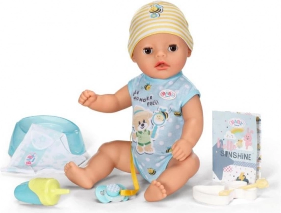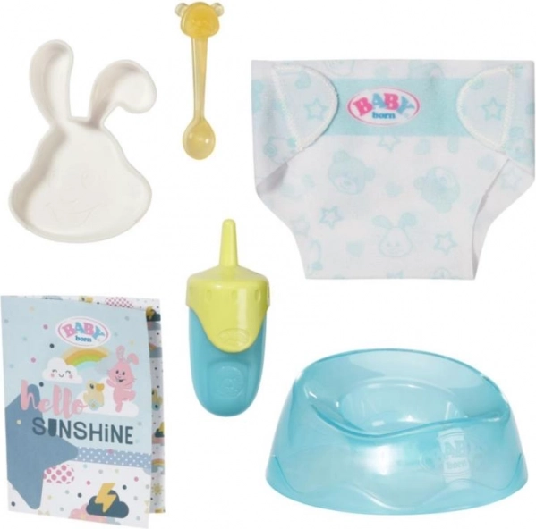 Das Set enthält eine Flasche, Schnuller, Schnuller mit Band, Windeln und weiteres Zubehör für vollständige Pflege und Spiel.
