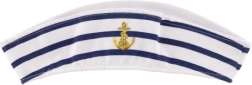 Tauche ein in die Welt des Meeres mit der klassischen Seemannsmütze, die durch reines Weiß, blaue Streifen und ein aufgesticktes Ankersymbol hervorsticht. Die Mütze ist aus angenehm zu tragendem Textil gefertigt, sodass du sie problemlos den ganzen Abend tragen kannst.