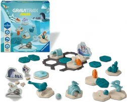 Erweiterung Eis-Abenteuer ist eine Ergänzung für jedes GraviTrax Junior Starter-Set. Es enthält mehr als dreißig verschiedene Elemente, mit denen Sie eine Bahn bauen können, die durch frostige, arktische Gebiete führt! Die Plastikkugel passiert ein Iglu und eine Eishöhle und trifft unterwegs auf lustige Tiere!