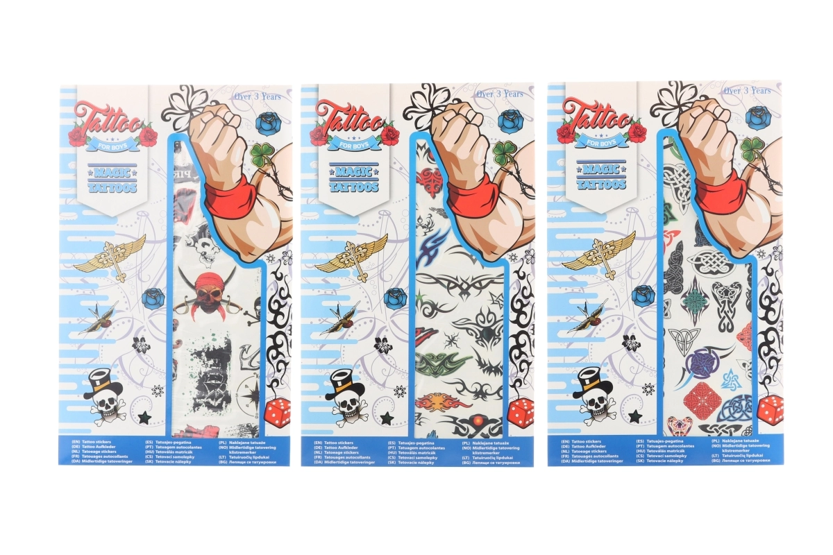 Das Set temporärer Tattoos für Jungen bietet eine bunte Auswahl an Motiven, die kleine Abenteurer begeistern. Die Tattoos lassen sich mit Wasser leicht auf die Haut übertragen und waschen sich nach einigen Tagen von selbst ab. Perfekt als kleine Geschenke, Belohnungen oder Kostüm-Accessoires.