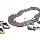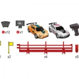 Im Paket finden Sie alles für sofortige Rennen: 2 Rennfahrzeuge, 2 Hand-Controller und praktisches Zubehör. Dank der kompakten Maße von 90 × 65 cm passt die Bahn auf den Tisch oder ins Kinderzimmer.