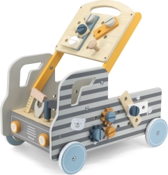 Diese rollbare Werkbank in Autoform kombiniert einen Arbeitstisch mit einem interaktiven Bauset. Alles besteht aus Holz und ist für kleine Hände angepasst, damit Kinder den Umgang mit Werkzeugen sicher ausprobieren können. Das Set weckt Neugier, fördert Geduld und unterstützt die Hand–Auge-Koordination.