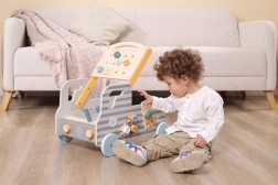 Ein Arbeitstisch mit Werkzeug, den Kinder ganz leicht mitnehmen können. Der Wagen mit Stauraum fördert Ordentlichkeit und unterstützt das selbstständige Spiel.