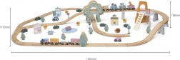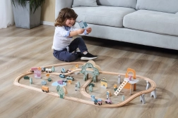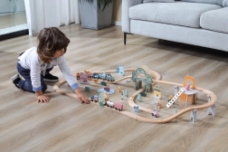 Das umfangreiche Set enthält Schienen, Erhöhungen, eine Brücke, einen Zug mit Waggons sowie zahlreiches Zubehör. Kinder ändern spielend die Strecken und erfinden bei jedem Spiel neue Geschichten.