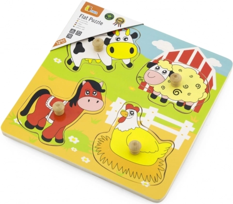 Die robuste Holzplatte mit ungefähren Maßen von 22 × 22 cm ist reich mit einem Bauernhofmotiv illustriert, das zum Weiterspielen anregt und den Wortschatz erweitert (z. B. Kuh, Schaf, Pferd, Henne). Das Spielzeug ist ab 12 Monaten geeignet und lässt sich dank der kompakten Maße leicht verstauen und transportieren.