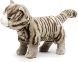 Weicher Plüsch mit feiner Streifung und blauen Augen wirkt glaubwürdig und lädt zum Kuscheln ein.