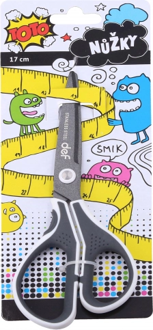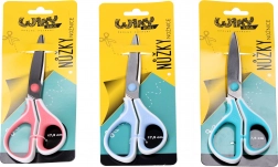 Praktische bunte Schere mit einer Länge von 17,5 cm, mit ergonomisch geformtem, weichem Griff und rutschfestem Gummieinsatz. Geeignet für Schule, Haushalt und Büro. Erhältlich in 3 Farbvarianten.