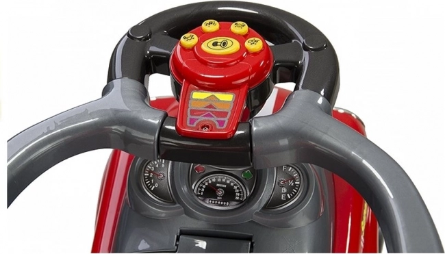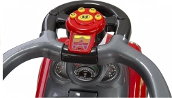 Schutzbügel um den Sitz und klappbare Fußstützen bieten Stabilität und Komfort bei längeren Ausfahrten. Das interaktive Lenkrad mit Musik- und Soundtasten unterstützt die Wahrnehmung und das analytische Denken, während schrittweise abnehmbare Teile (Bügel, Schiebestange) erlauben, das Rutschauto an Alter und Fähigkeiten des Kindes anzupassen.
