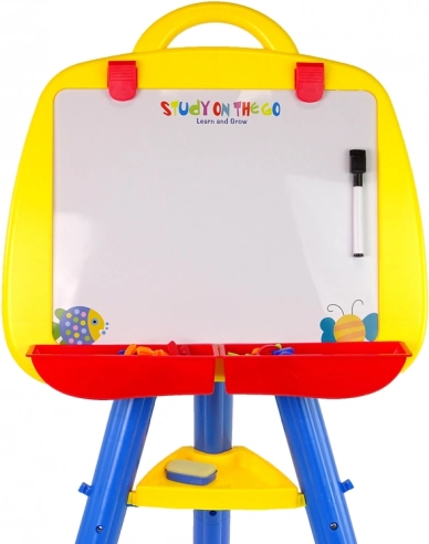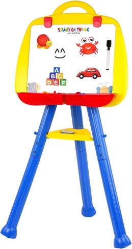 Die Tafel ist mit Clips ausgestattet, die das Befestigen von Papier zum Zeichnen ermöglichen, wie auf einer echten Malerstaffelei. Ebenfalls enthalten sind zwei Behälter für Kunstutensilien wie Pastelle und Marker. Die Tafel ist so angepasst, dass sie auf unterschiedliche Höhen je nach Größe Ihres Kindes eingestellt werden kann.
