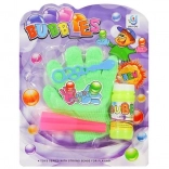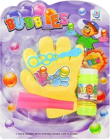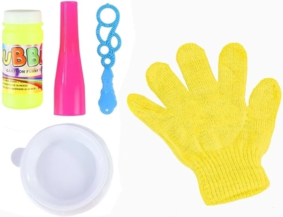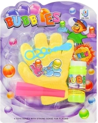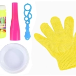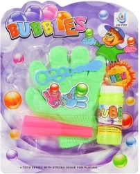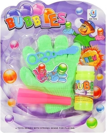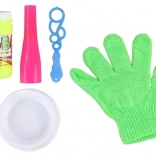 Die spezielle Oberfläche des Handschuhs ermöglicht es, Seifenblasen auf der Handfläche und den Fingerspitzen zu fangen, zuzuspielen und einfache Tricks zu üben.