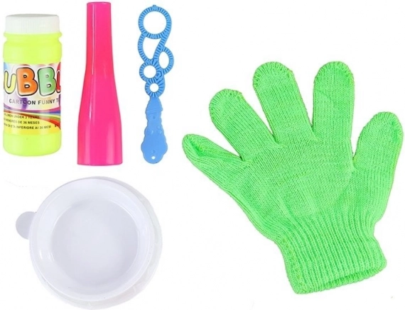 Im Set enthalten sind eine Schale für die Lösung, ein Stab, ein rosa Trichter/Röhrchen, eine Flasche mit Lösung und ein Universalhandschuh – einfach öffnen und losspielen.