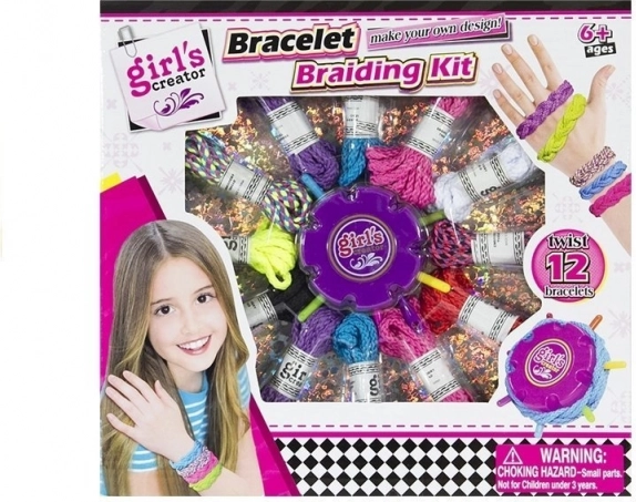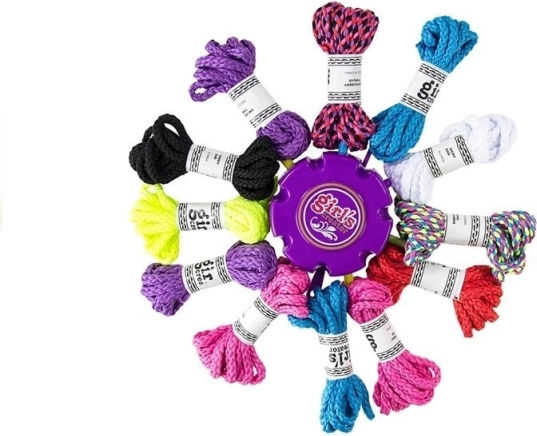 Das Set enthält 12 bunte Schnüre, der Schnurdurchmesser beträgt etwa 0,5 cm. Jede kann zur Herstellung eines Armbands oder eines geflochtenen Zopfs verwendet werden. Außerdem ist ein Hilfsgerät im Lieferumfang enthalten, das das Flechten und die Armbandherstellung erleichtert.