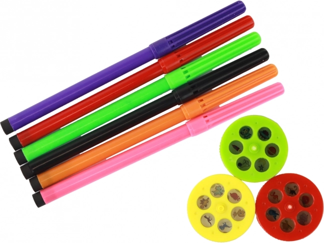 Der Projektor ermöglicht das Malen verschiedener Bilder mit bunten Stiften, die nach Belieben ausgetauscht werden können.