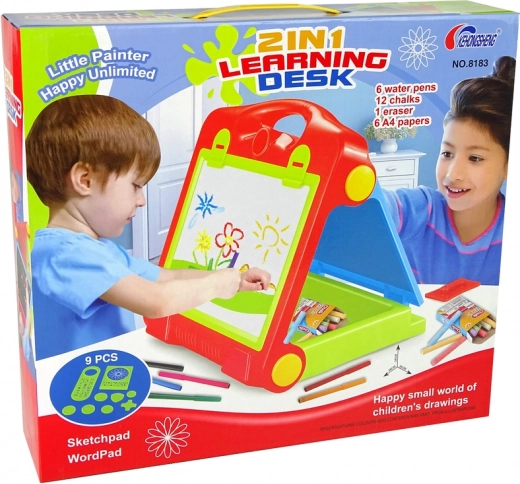 Die klappbare Kindertafel 2-in-1 ist das ideale Werkzeug zur Förderung künstlerischen Empfindens und Kreativität bei Kindern. Es können bis zu zwei Kinder gleichzeitig zeichnen und spielen, was Teamarbeit und das Teilen von Ideen fördert. Die Tafel enthält ein praktisches Set an Zubehör.