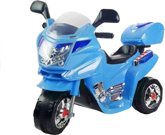 Weitere Elemente, die große Vorzüge der Konstruktion des Modells HC8051 darstellen, sind die transparente Verkleidung, Seitenspiegel und die LED-Beleuchtung, die die Sichtbarkeit des Kindes auf der Straße erhöht. Der hintere Teil des blauen Motorrads verfügt über einen zu öffnenden Kofferraum, in dem der kleine Fahrer seine Schätze aufbewahren kann. Er dient auch als Rückenlehne für das Kleinkind und ist eine Sicherung, die verhindert, dass es zu weit nach hinten rutscht. Ein unübersehbares Element sind die Hup- und Musikknöpfe in der Nähe des Lenkrads. Jetzt kann sich jeder Kleine in die Rolle eines echten Fahrers versetzen und seinen vorbeifahrenden Freunden hupen.