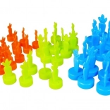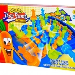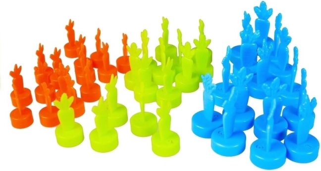 Das Spiel enthält bunte Plastikmöhren in Orange, Grün und Blau, die unterschiedliche Punktwerte darstellen. Diese Elemente sind ideal für ein spannendes und visuell ansprechendes Spiel.
