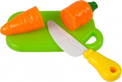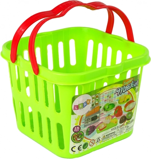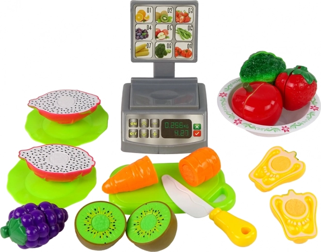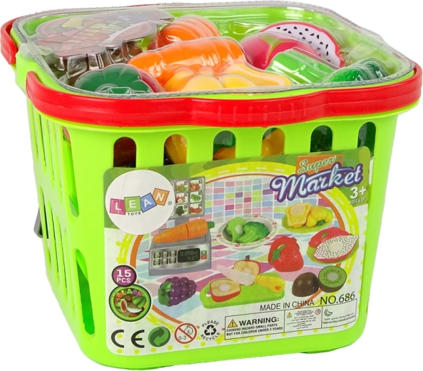 Das Set besteht aus einem grünen Korb, gefüllt mit verschiedenem Obst und Gemüse, außerdem aus einer Schüssel, Tellern, einem Messer, einem Schneidebrett und einer Einkaufswaage. Die Lebensmittel können auf das beiliegende Brett gelegt und mit einem Spezialmesser geschnitten werden. Die Hälften von Obst und Gemüse lassen sich auf einer Waage wiegen, die eine genaue Kopie der Waagen in Supermärkten ist, und anschließend auf Tellern anrichten oder in der Schüssel mischen. Nach der Verkostung können die Hälften von Obst und Gemüse einfach und sofort wieder verbunden werden. Wie? Alle Lebensmittel sind mit speziellen Klettbändern versehen, die ein wiederholtes Trennen und Kombinieren ermöglichen.