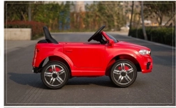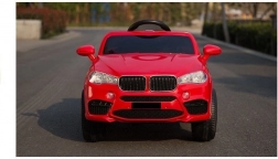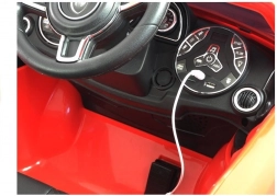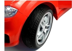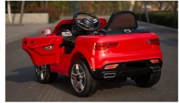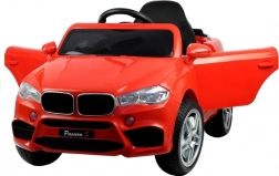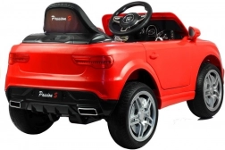 Das rote elektrische Auto ist sorgfältig gestaltet, um wie ein echter Luxuswagen auszusehen, mit Details wie Lichtern und öffnenden Türen.