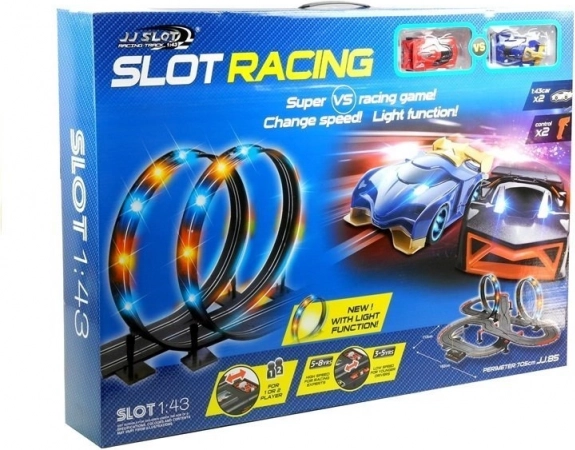 Die realistische Autorennbahn mit zwei Schleifen und farbiger LED-Beleuchtung bietet flüssige und spannende Rennen von zwei Fahrern gleichzeitig. Dank des übersichtlichen Bedienpults stellen Sie Streckengeschwindigkeit und Fahrzeugtempo für Einsteiger wie Fortgeschrittene ein und wählen die Spieleranzahl. Die Montage ist einfach und macht Spaß – das Spiel beginnt schon beim Aufbau.