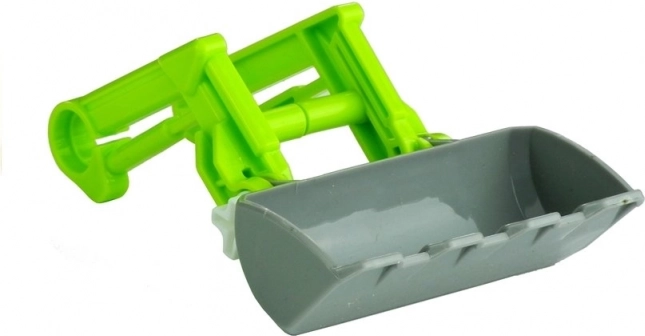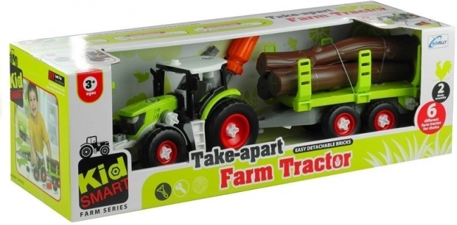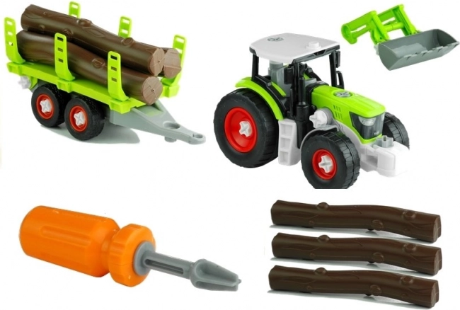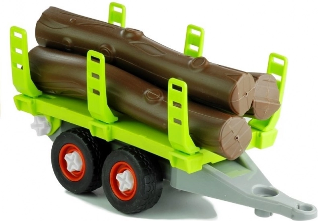 Das Spielzeug umfasst einen Traktor, einen Anhänger, Holzstämme und einen Baggerarm – alles aus robustem Kunststoff gefertigt.