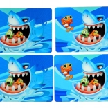Ziehe die Fische entsprechend der Karten und lass dich nicht erwischen – der Hai kann jederzeit zuschnappen! Ein schnelles, lustiges Spiel für Kinder und Erwachsene, das Aufmerksamkeit und Feinmotorik trainiert.