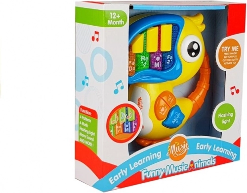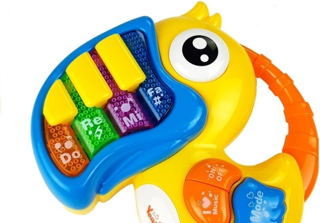 Das interaktive Piano in Form eines bunten Vogels ist mit musikalischen Tasten „Do“, „Re“, „Mi“ ausgestattet, die jedes Kind mit ihrer Farbigkeit und fröhlichen Konstruktion begeistern. Klang- und Lichteffekte helfen dabei, die Sinne und die Vorstellungskraft des Kindes zu entwickeln: