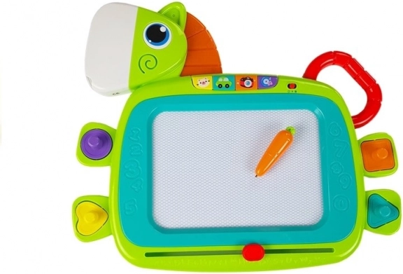 Entdecken Sie die unterhaltsame Magnettafel, mit der Kinder unendlich oft zeichnen und löschen können. Das große, mehrfarbige Display, vier fröhliche Soundtasten und ein Set Stempel verwandeln jede Idee in ein originelles Bild. Dank des bequemen Griffs kann Ihr Kind seine Maltafel überallhin mitnehmen.