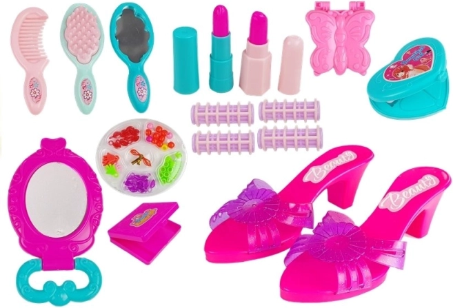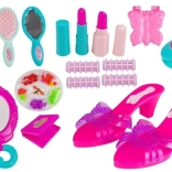 Im Set fehlen keine Essentials für kleine Stylistinnen: bequeme Kunststoff-Sandaletten, ein Haarstyling-Set mit Bürste, Kamm und Lockenwicklern, ein ovaler Spiegel, Perlen zur Schmuckherstellung und Lippenstift-Imitate. Alles ist übersichtlich im Koffer mit Tragegriff und Schnappverschluss verstaut, damit nichts verloren geht und das Aufräumen kinderleicht ist.