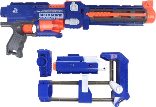 Der Karabiner für Schaumstoffpfeile ist mit einer massiven Konstruktion ausgestattet, die bequemes Halten und verschiedene Nutzungsarten ermöglicht. Er verfügt über zwei Schienen für die Montage von Zubehör - eine unter der Hauptkomponente zur Befestigung eines Halters mit rotem Licht und eine zweite mit abnehmbarer Schulterstütze. Der drehbare Mechanismus des Magazins mit offenen Kammern ermöglicht einfaches Nachladen.