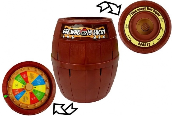 - Pirat, Fass mit Öffnungen, 16 bunte Schwerter, Glücksrad mit Farben