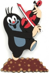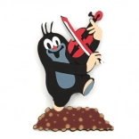 Kreatives Design mit Maulwurf und roter Geige, stehend auf einem braunen Hügel.