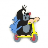 Bunte Schaumstoffdekoration mit Maulwurf auf einem gelben Roller, die jedes Kind verzaubert.