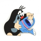 Süßer Maulwurf mit blauer Kanne, ideal als Teil der Kinderdeko.