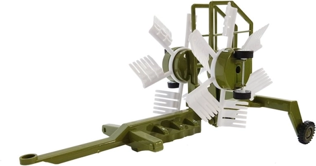 Der grün-weiße Schwader mit drehenden Zinken vermittelt Kindern die Prinzipien des Gras- bzw. Heusammelns und erweitert die Spielmöglichkeiten.