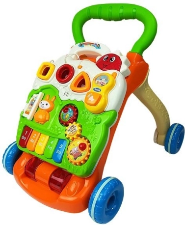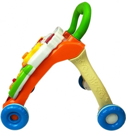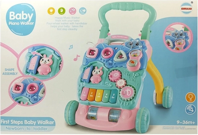 Unterstützen Sie die ersten selbstständigen Schritte Ihres Kindes auf sichere und spielerische Weise. Der bunt gestaltete Laufwagen verfügt über einen stabilen Griff, eine feste Basis und Räder mit Silikonstreifen für eine sanftere, kontrolliertere Fahrt. Das interaktive Panel mit 5-tastigem Klavier, Zahnrädern, aufklappbaren Türchen und einem niedlichen Häschen fördert Sehen, Hören und Feinmotorik.