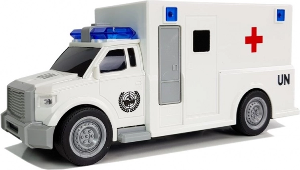 Dieses interaktive Krankenwagen-Modell ist ein großartiges Spielzeug für Kinder, die Action und Rettungseinsätze lieben. Die realistische Ausführung und funktionalen Details fördern Fantasie und Motorik. Durch Drücken der Taste auf dem Dach werden Licht und Sound aktiviert, der Reibungsantrieb lässt das Fahrzeug ohne Batteriebetrieb der Räder nach vorn fahren.