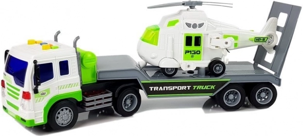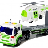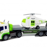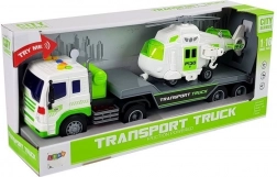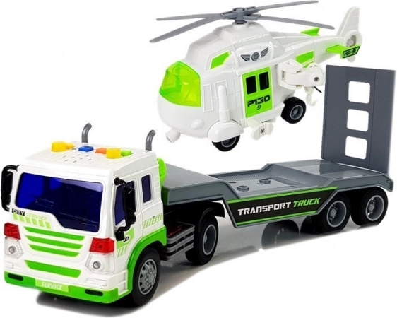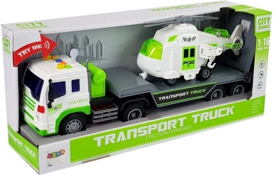 Dieser detailreich gestaltete Transport-Lkw in Weiß-Grün verfügt über eine lange Plattform zum bequemen Verladen des Hubschraubers oder weiterer Fahrzeuge. Die hintere kippbare Rampe erleichtert das Auffahren und die sichere Fixierung der Ladung. Für Spaß sorgen Licht- und Soundeffekte – auf dem Kabinendach finden sich 4 Tasten für Motorstart, Hupe, Fahr- und Rückfahrgeräusch. Dank Friktionsantrieb genügt es, das Auto nach hinten zu ziehen und loszulassen.