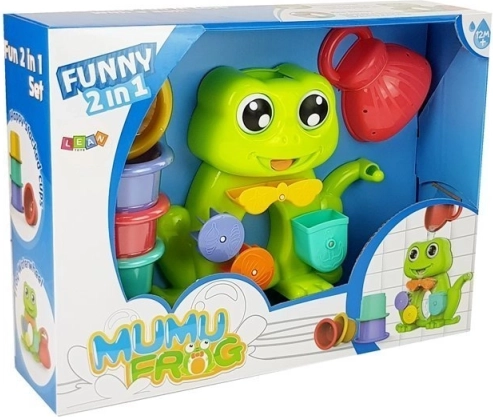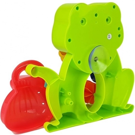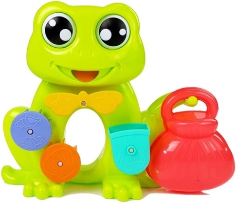 Dieser niedliche Frosch mit drehbaren Elementen lädt Kinder zum Spielen in der Badewanne ein. Wird Wasser in ihren Kopf gegossen, setzt sich ein kleines Wasserrad in Gang, das einen Wasserfluss durch das Maul des Frosches erzeugt. Außerdem hat der Frosch Augen, die sich bei Wasserfluss drehen, was jedes Kind fasziniert und amüsiert.