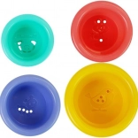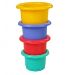 Das Set enthält vier verschiedene bunte Eimer mit Löchern, um den Wasserfluss zu beobachten.