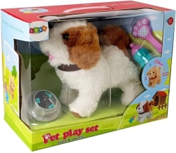 Das Set enthält eine Flasche, eine Bürste und einen Napf mit Futter, was ein realistisches Spielen und Pflegen des Hundes ermöglicht.
