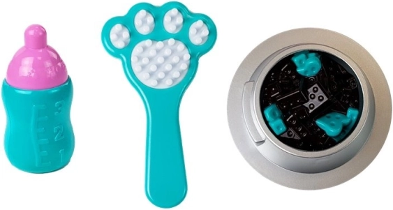 Das Set enthält eine Flasche, eine Bürste und einen Napf mit Futter, was ein realistisches Spielen und Pflegen des Hundes ermöglicht.