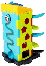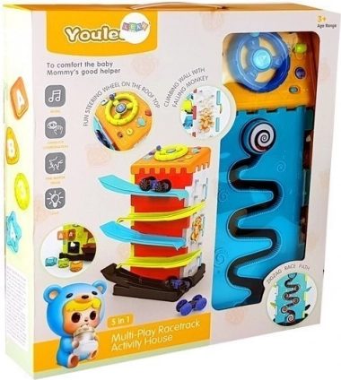 Das Spielzeug ermöglicht es Kindern, Formen zu erkennen, Räder zu lenken und mit einem herunterfallenden Affen zu spielen.