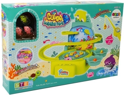 Das Set umfasst Delfine, Entchen und Fischlein, zwei Aquarien, Angelruten, Teile der Rutsche sowie Aufkleber – alles für kreative und langanhaltende Unterhaltung.