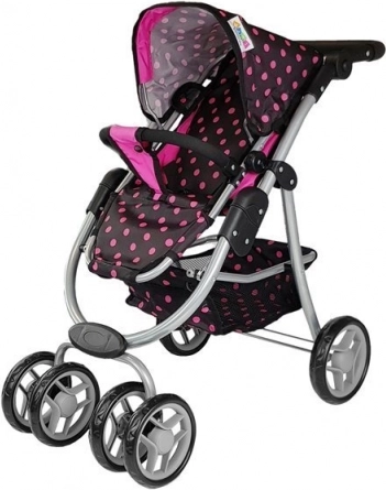 Der Puppenwagen kombiniert Spiel und Lernen und fördert so die Entwicklung von Empathie und verantwortungsvollem Verhalten bei Kindern. Elegantes schwarzes Design mit rosa Punkten erinnert an echte Kinderwagen und regt kreatives Spielen an. Die Konstruktion aus robusten Aluminiumrohren und Kunststoffverbindungen garantiert Langlebigkeit und eine stabile Fahrt.