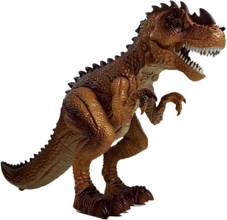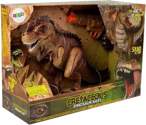 Der interaktive Dinosaurier begeistert alle Fans der Urzeit und actiongeladener Geschichten. Nach dem Einschalten bewegt er sich selbstständig nach vorne, es sind Schritte und ein furchteinflößendes Brüllen zu hören und die Augen leuchten rot. Durch Drücken des Abzugs an der Pistole starten Sie das Duell – jeder Treffer löst Licht- und Soundeffekte aus; beim neunten Treffer bricht der T‑Rex zusammen und spielt einen Niederlageneffekt ab.